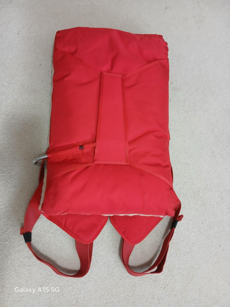 is rated at 150 KIAS with up to 220 lbs. The container and conventional harness are all red. It also comes with a matching red carry bag and also a removable sheepskin backpad.